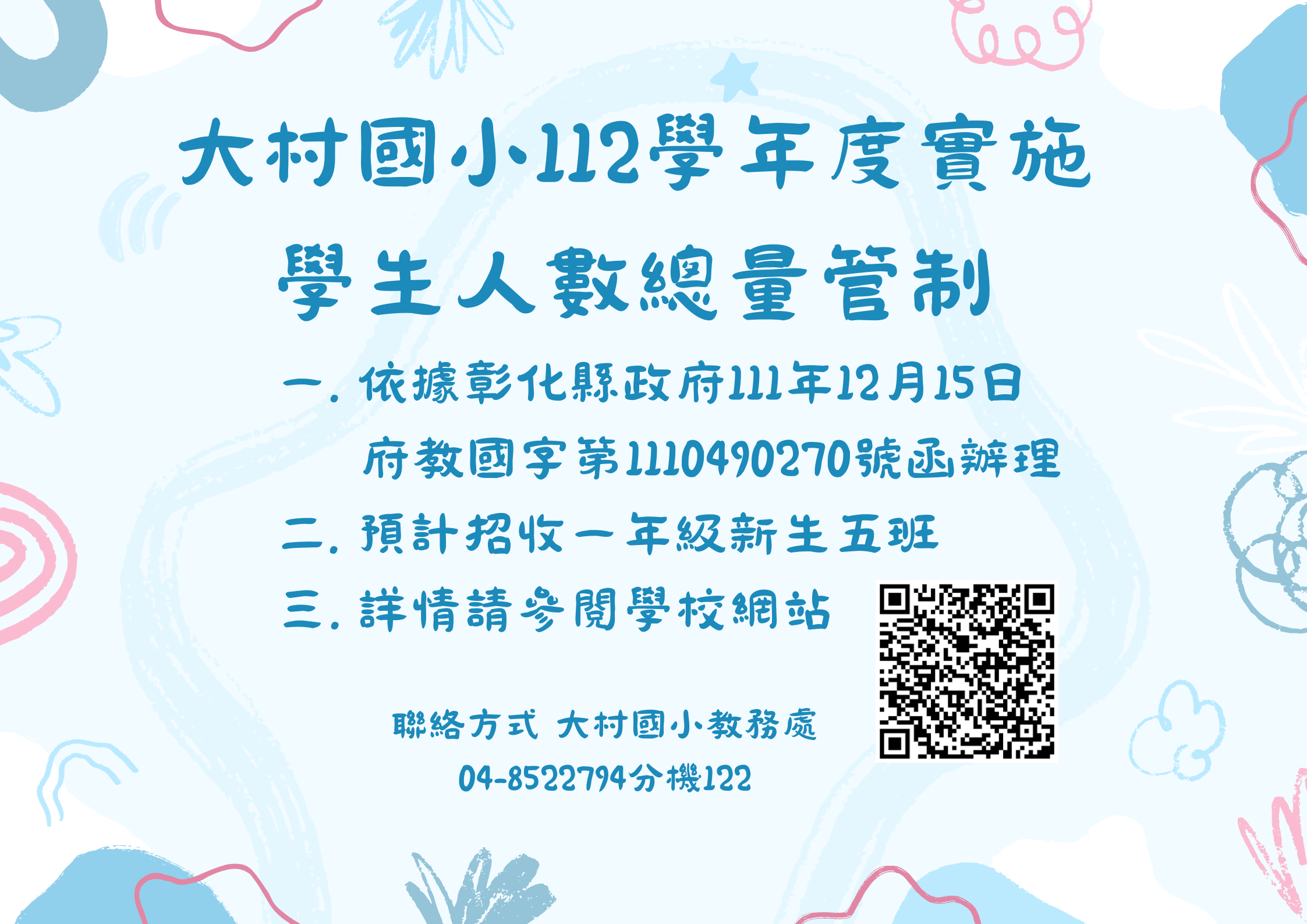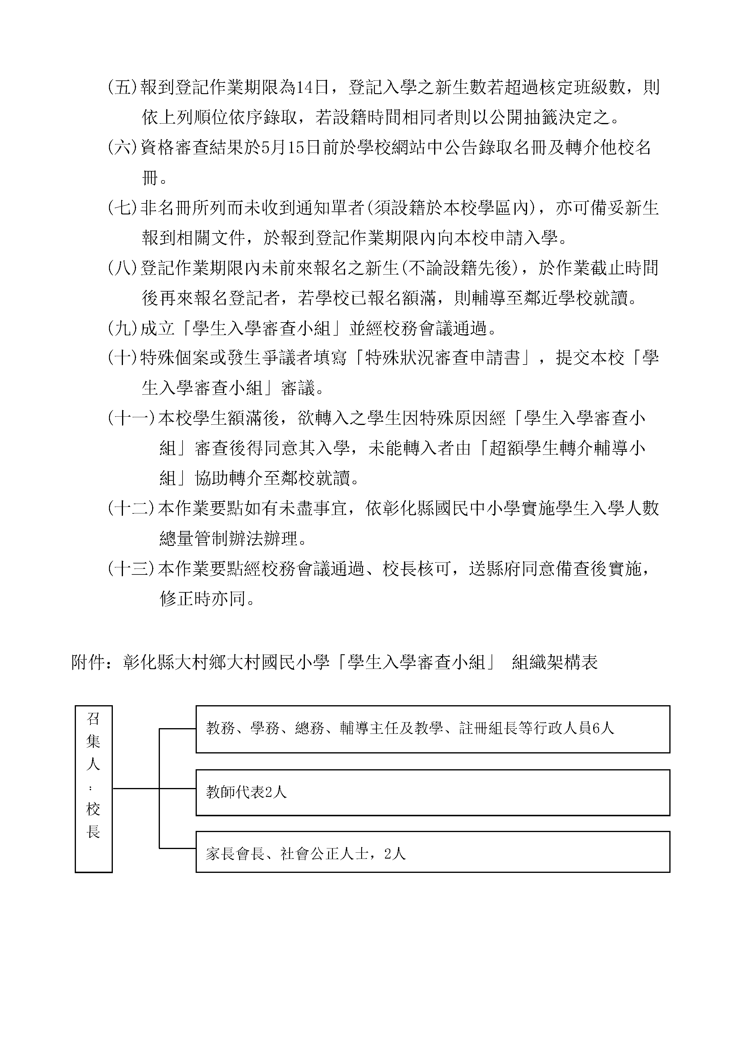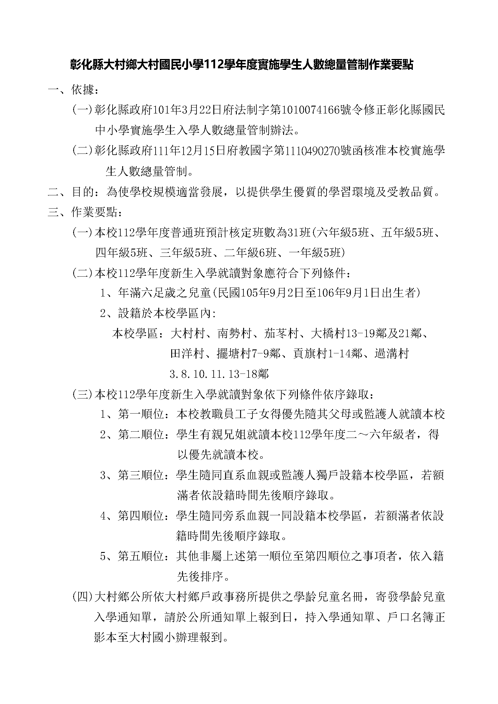 彰化縣大村鄉大村國民小學112學年度實施學生人數總量管制作業要點