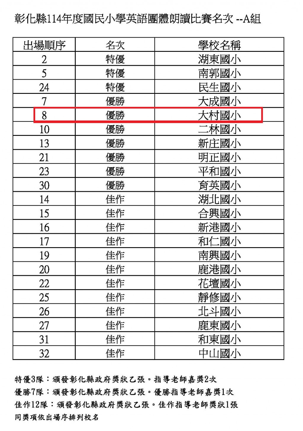 今天六年乙班代表學校參加《彰化縣114年度英語團體朗讀比賽》,在A組共32校的激烈競爭中,榮獲優勝!!