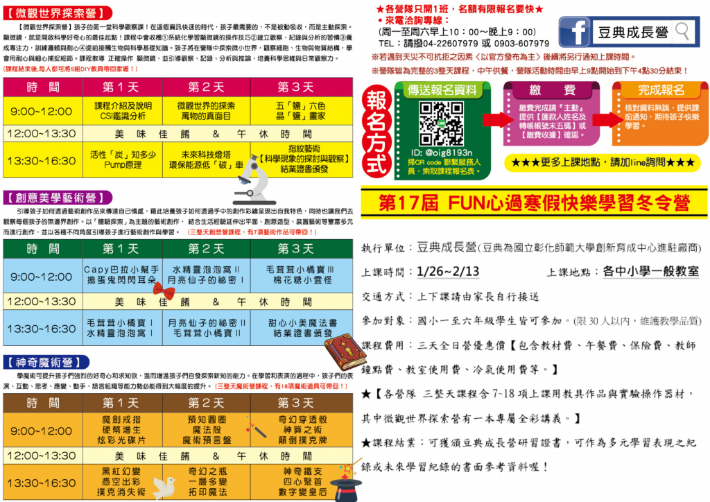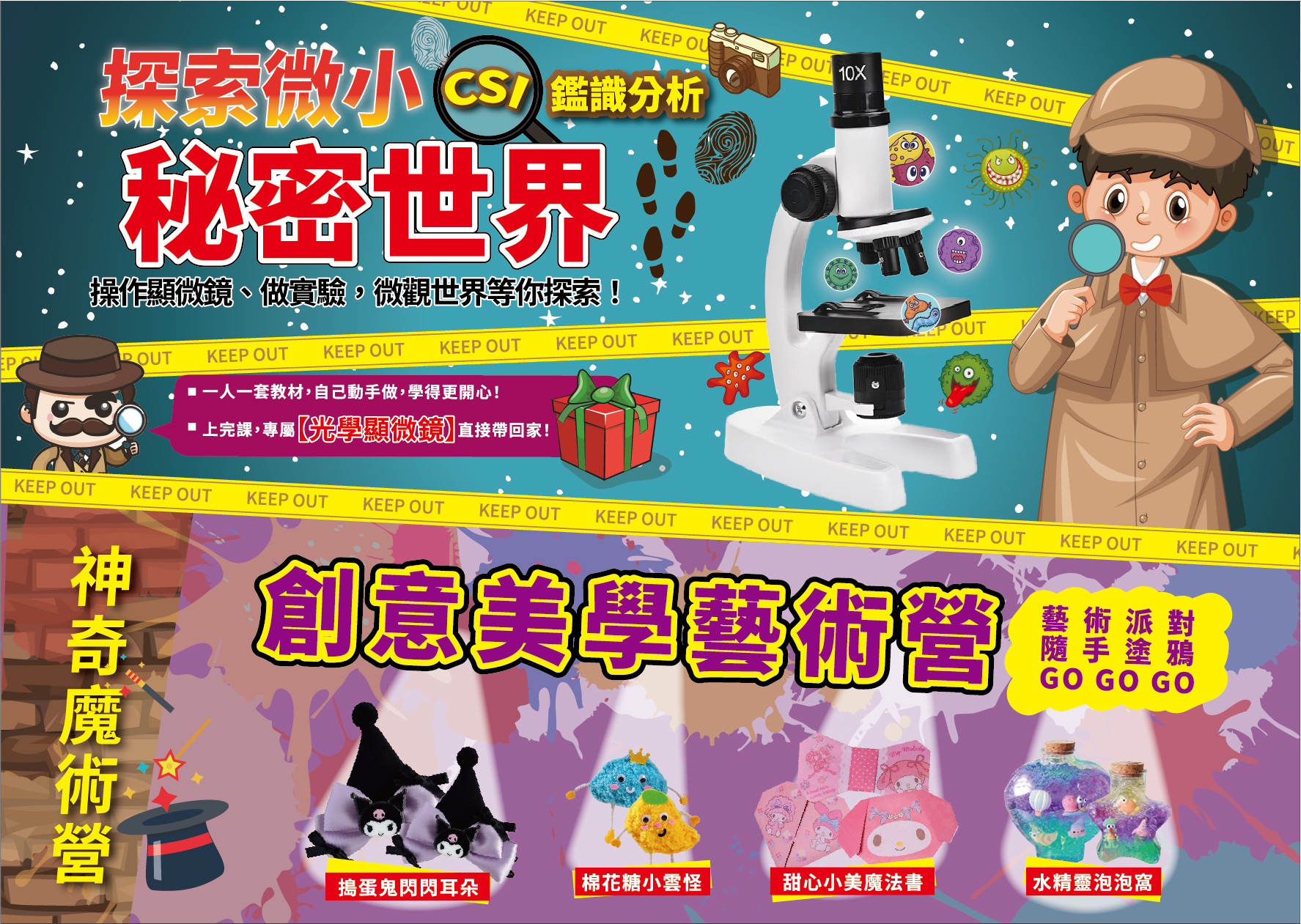 寒期活動分為微觀世界探索營、創意美學藝術營、神奇魔術營三項,歡迎貴校學生踴躍報名參加。