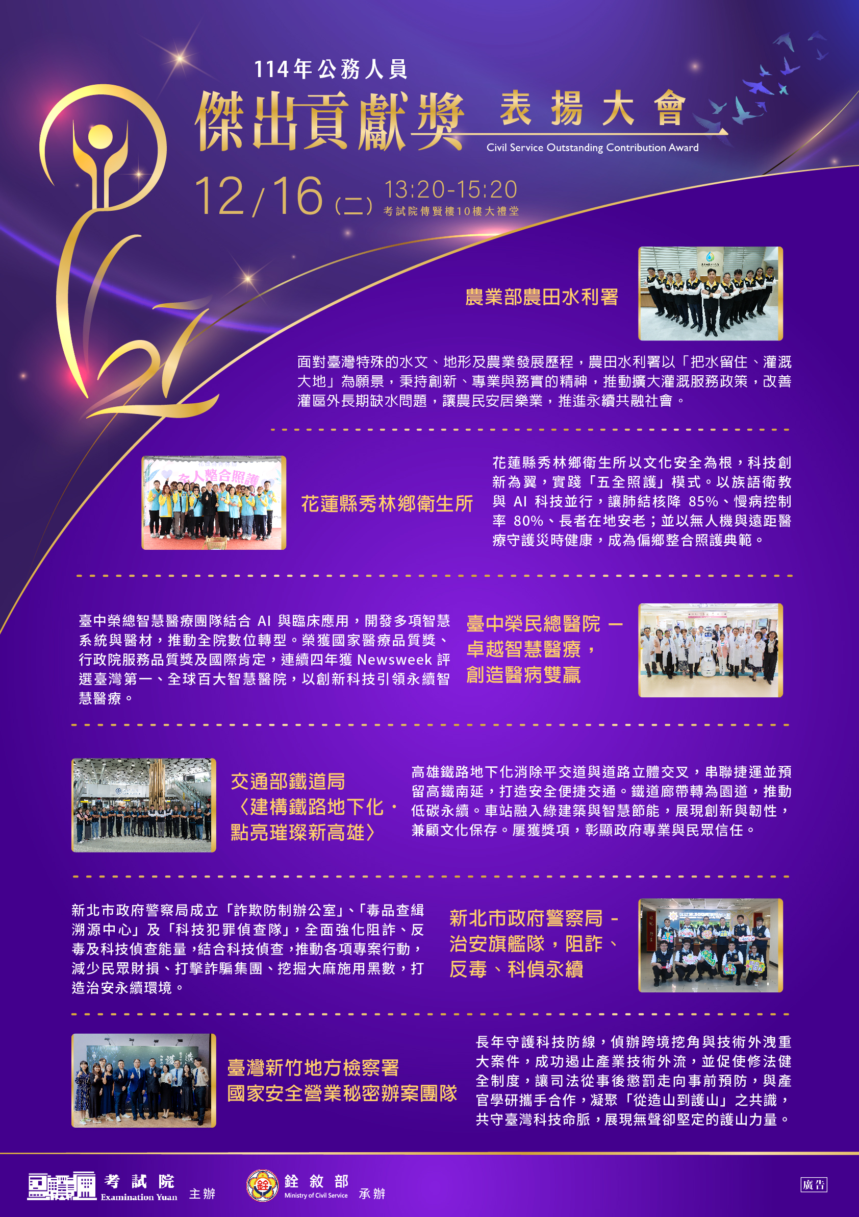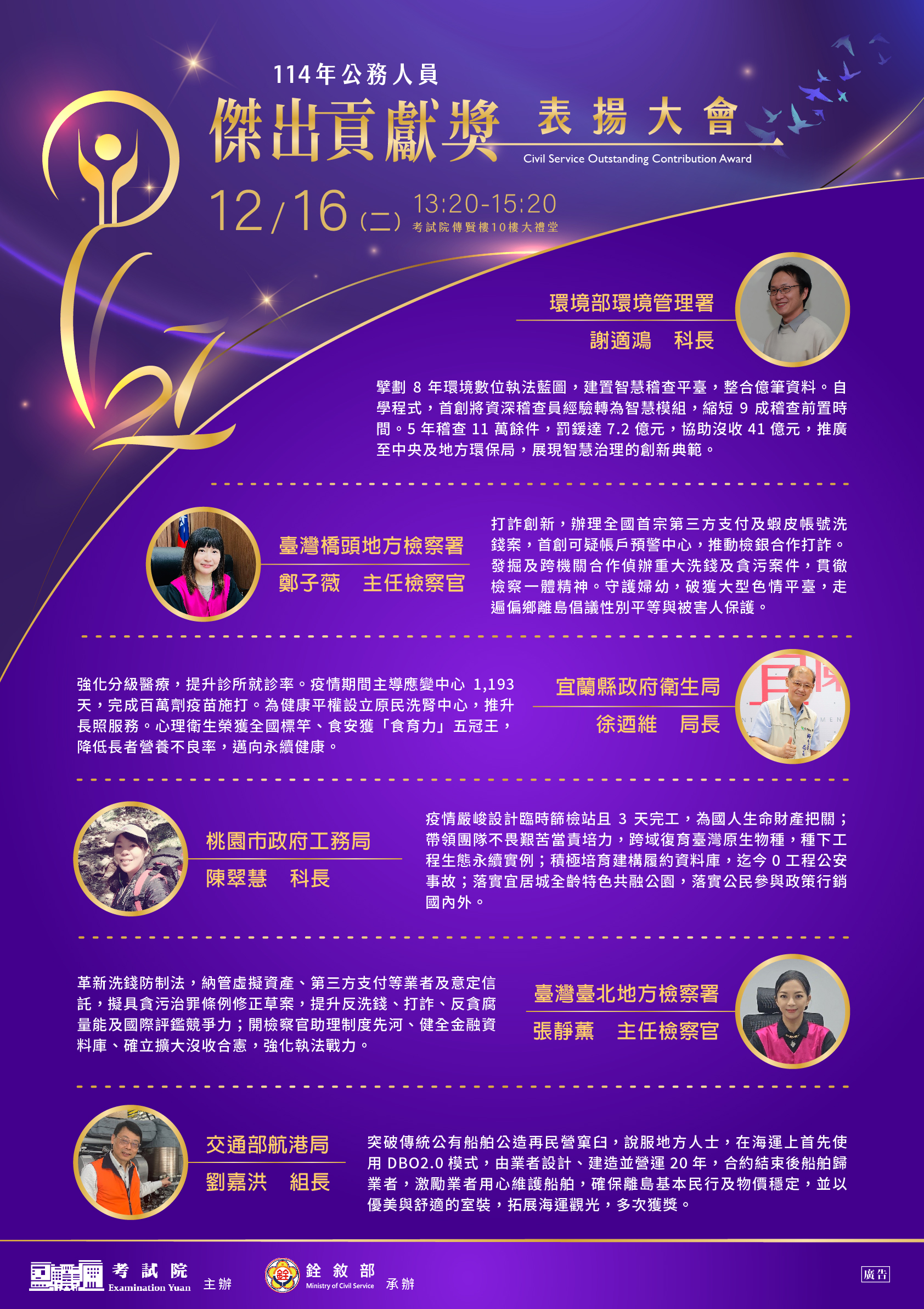 本(114)年公務人員傑出貢獻獎業經考試院組成評審委員會評選出6名得獎人及6組得獎團體。為表揚得獎者傑出事蹟,考試院訂於本年12月16日(星期二)下午1時20分於考試院傳賢樓10樓大禮堂舉行表揚大會。