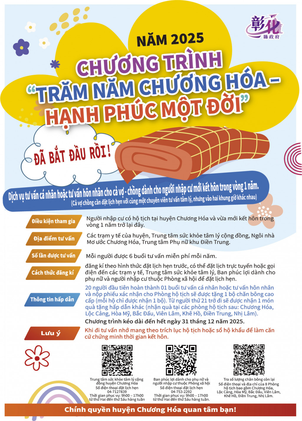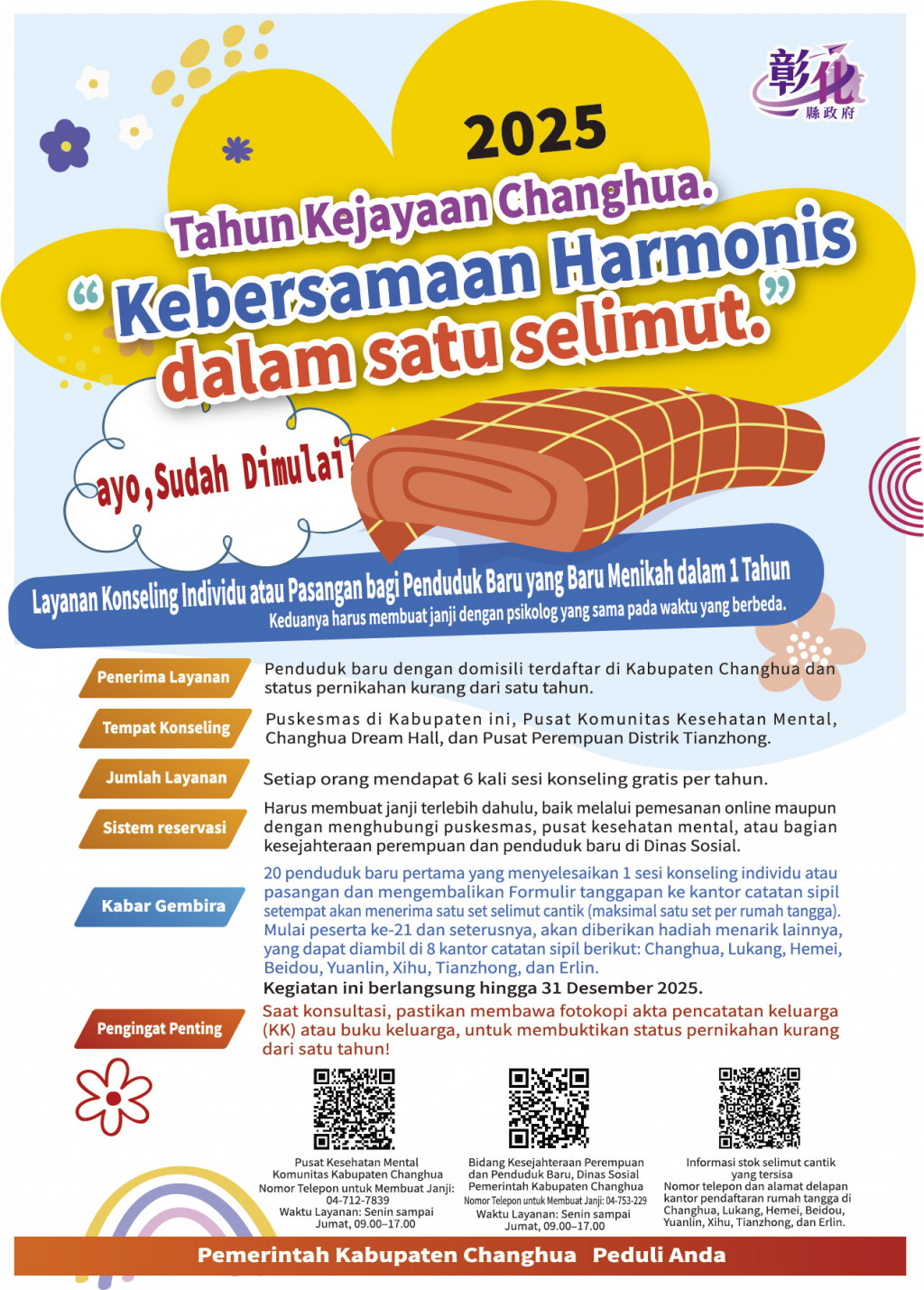 服務對象為戶籍設於彰化縣且結婚登記一年內之新住民,本服務採預約制,請以網路預約或電洽各衛生所、心理衛生中心、社會處婦女及新住民福利科預約。內文另有越南文及印尼文版本。
